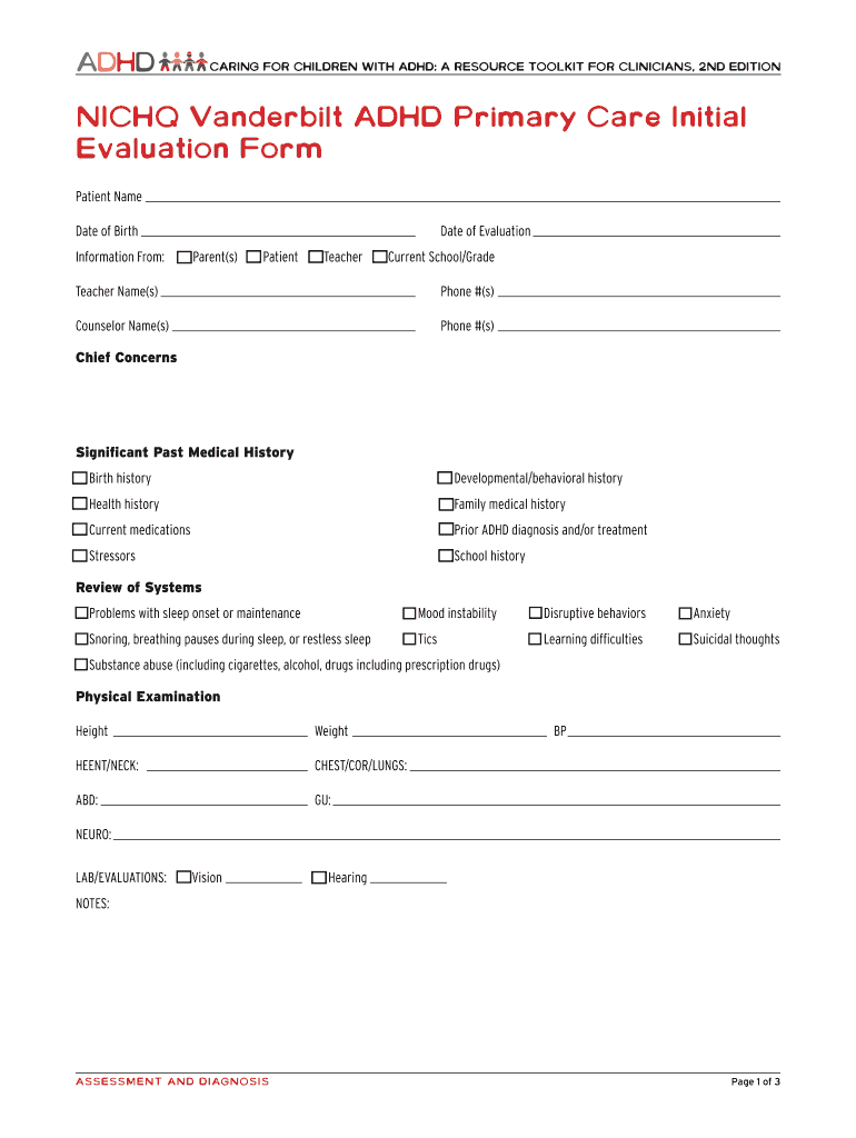 CARING FOR CHILDREN WITH ADHD: A RESOURCE TOOLKIT FOR CLINICIANS, 2ND EDITION NICHE Vanderbilt ADHD Primary Care Initial Evaluation Form Patient Name Date of Birth Information From: Date of Evaluation