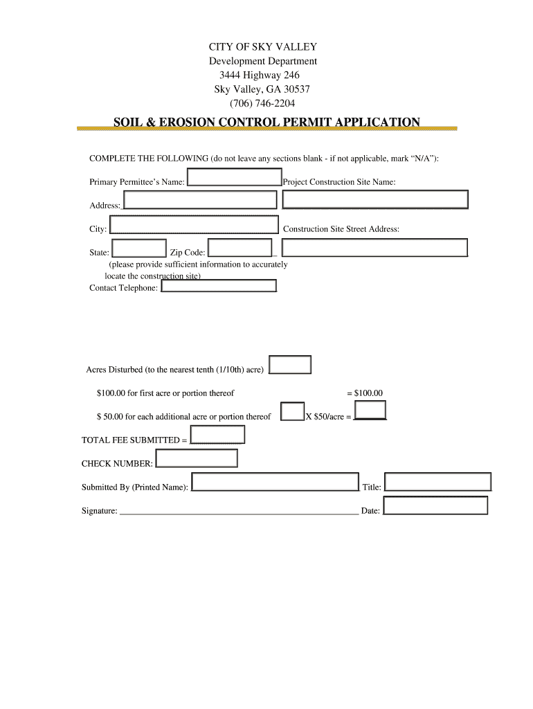CITY OF SKY VALLEY Development Department 3444 Highway 246 Sky Valley, GA 30537 (706) 7462204 SOIL & EROSION CONTROL PERMIT APPLICATION COMPLETE THE FOLLOWING (do not leave any sections blank if not