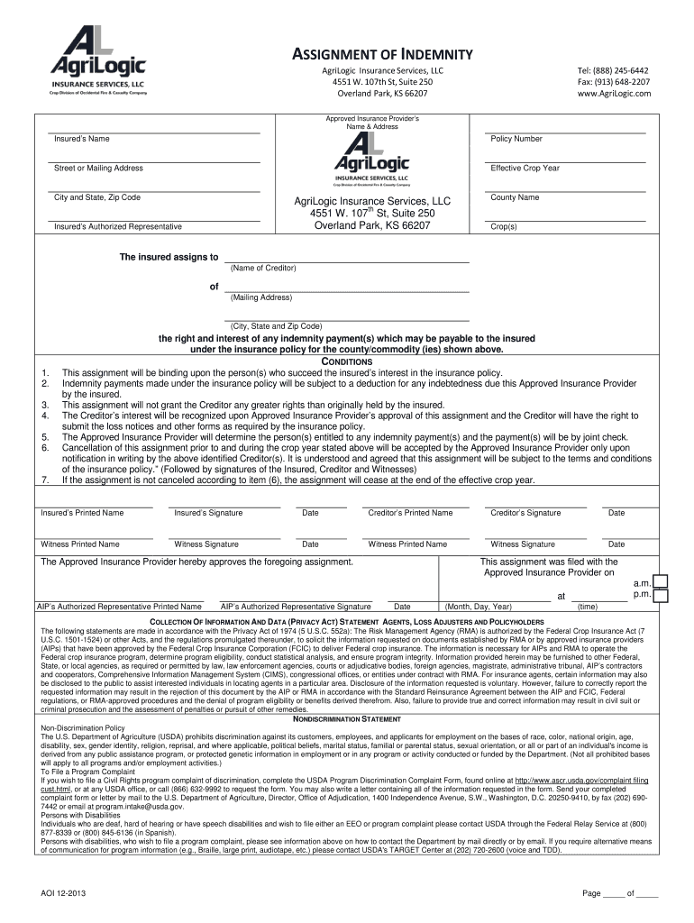 Get the free ASSIGNMENT OF INDEMNITY - AgriLogic Insurance