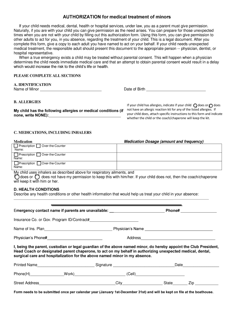 AUTHORIZATION for medical treatment of minors If your child needs medical, dental, health or hospital services, under law, you as a parent must give permission. Naturally, if you are with your child