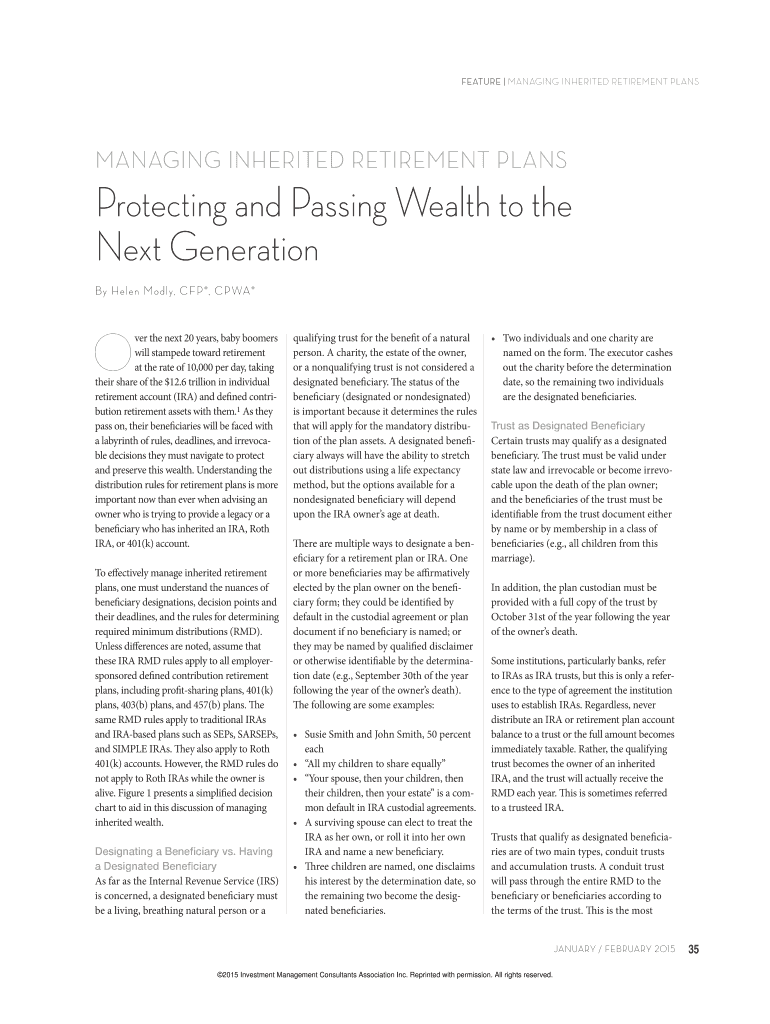 FEATURE MANAGING INHERITED RETIREMENT PLANSMANAGING INHERITED RETIREMENT PLANSProtecting and Passing Wealth to the Next Generation By Helen Molly, CFP, CPA Over the next 20 years, baby boomers will