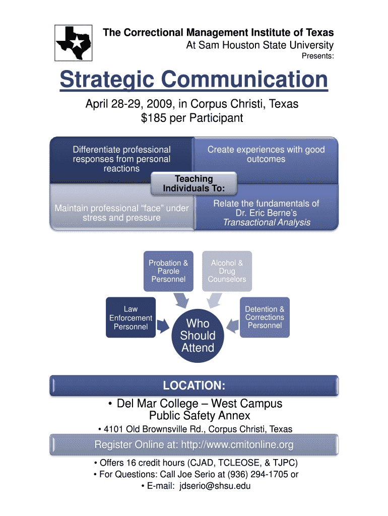 The Correctional Management Institute of Texas At Sam Houston State University Presents: Strategic Communication April 2829, 2009, in Corpus Christi, Texas $185 per Participant Create experiences