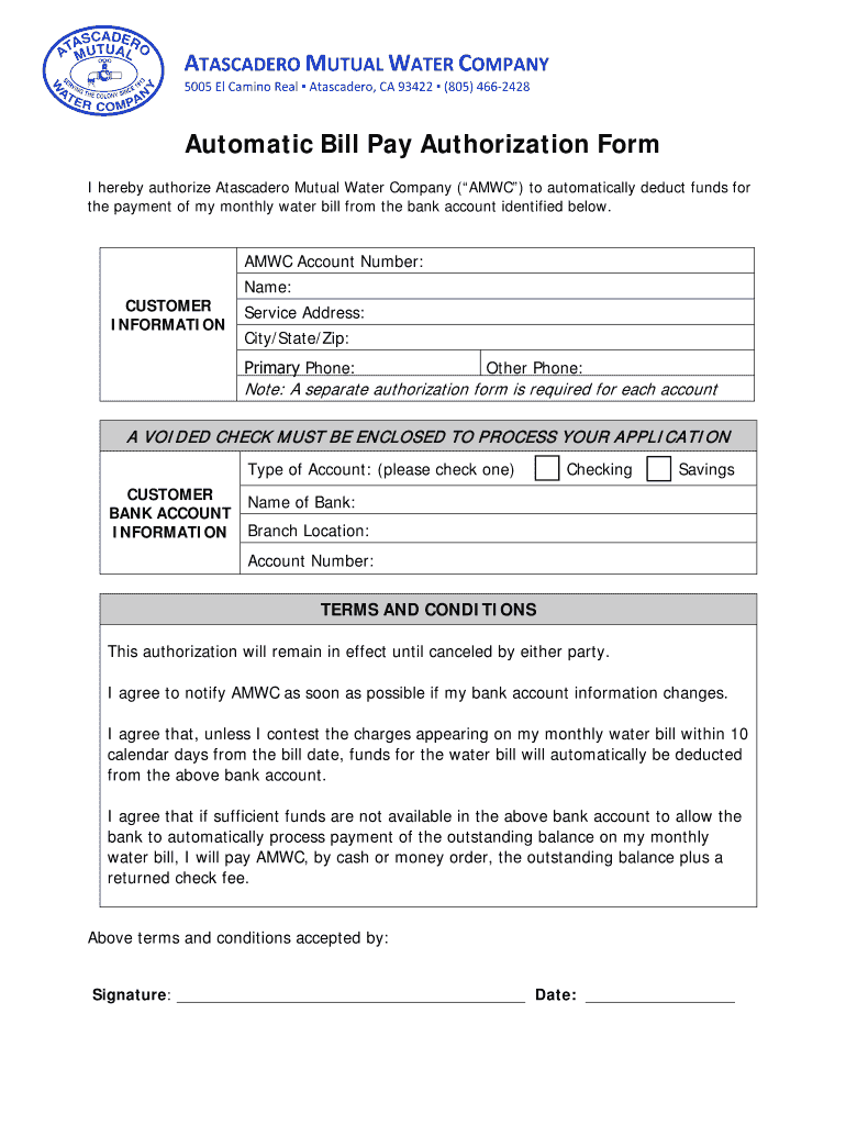 Get the free QuotAutomatic Bill Payment Authorization bFormbquot - Atascadero Mutual bb