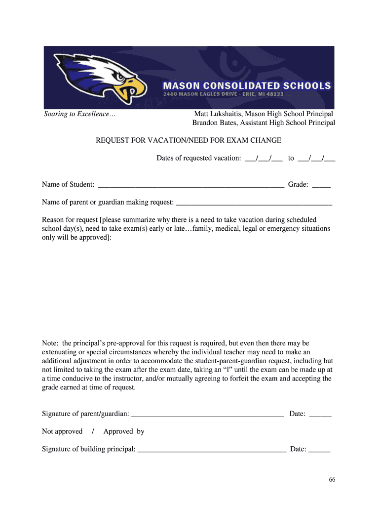 Soaring to Excellence Matt Lukshaitis, Mason High School Principal Brandon Bates, Assistant High School Principal REQUEST FOR VACATION/NEED FOR EXAM CHANGE Dates of requested vacation: / / to / /