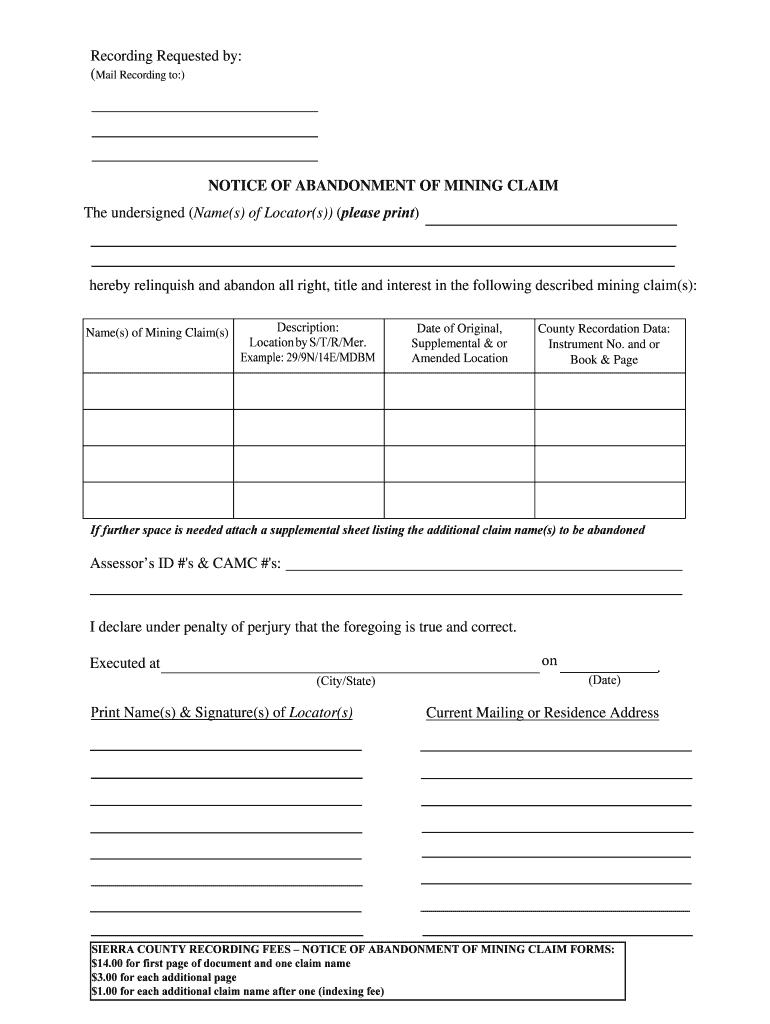 Get the free NOTICE OF ABANDONMENT OF bMININGb bCLAIMb - Sierra County CA