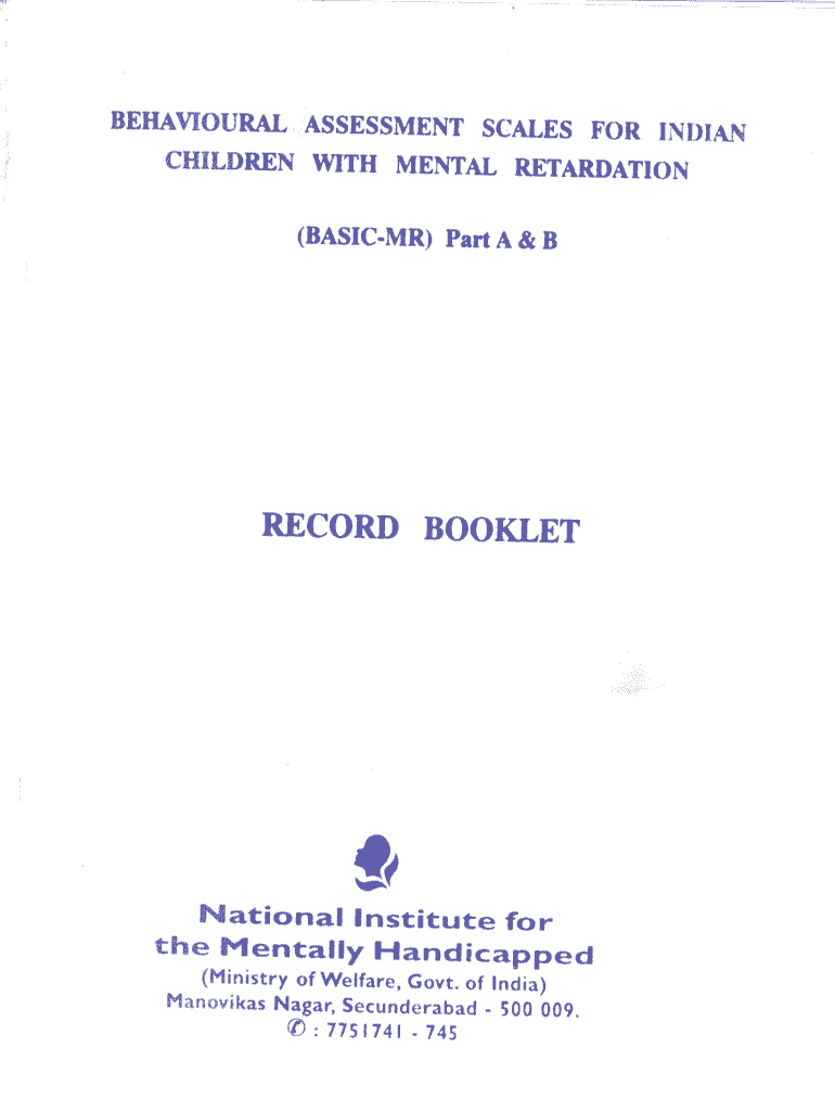 BEHAVIOUgjj, ASSESSMENT SCALES FOR INDIAN CHILDREN WITH MENTAL RETARDATION (BASIC.MR) Part A & B RECORD BOOKLET National Institute for the Mentally Handicapped (Ministry of Welfare, Govt. of India)