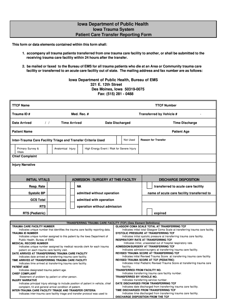 Key Features of the Iowa Trauma System Patient Care Transfer Form