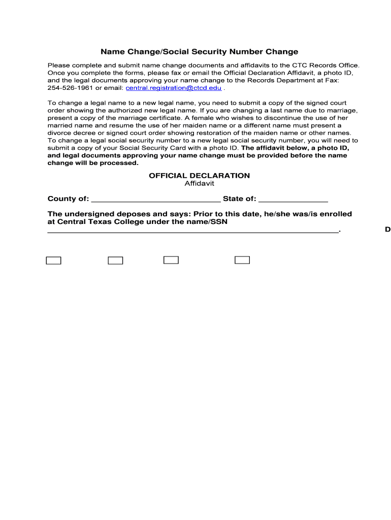 Save Form Print Form Name Change/Social Security Number Change Please complete and submit name change documents and affidavits to the CTC Records Office. Once you complete the forms, please fax or