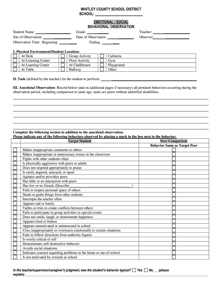 Get the free EMOTIONAL SOCIAL BEHAVIORAL OBSERVATION Observation Time - whitley k12 ky