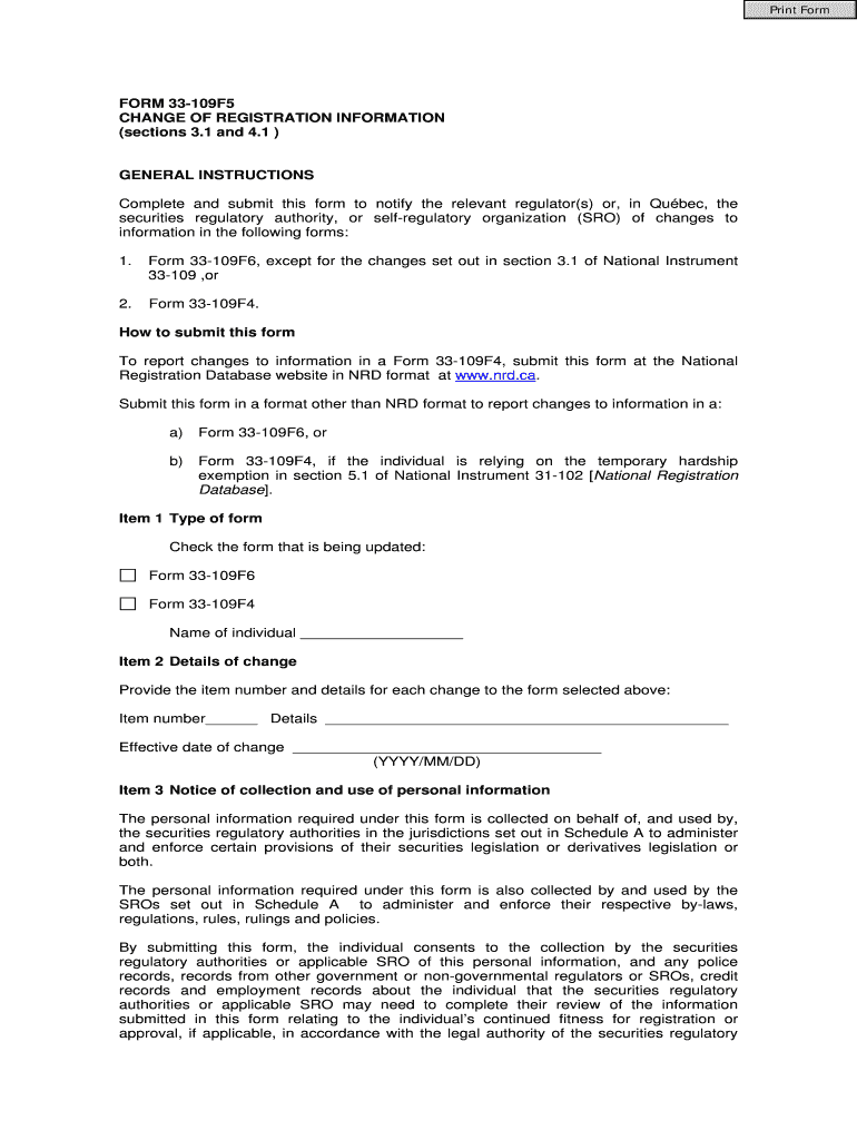 Print Form 33109F5 CHANGE OF REGISTRATION INFORMATION (sections 3.1 and 4.1) GENERAL INSTRUCTIONS Complete and submit this form to notify the relevant regulator(s) or, in Quebec, the securities regulatory