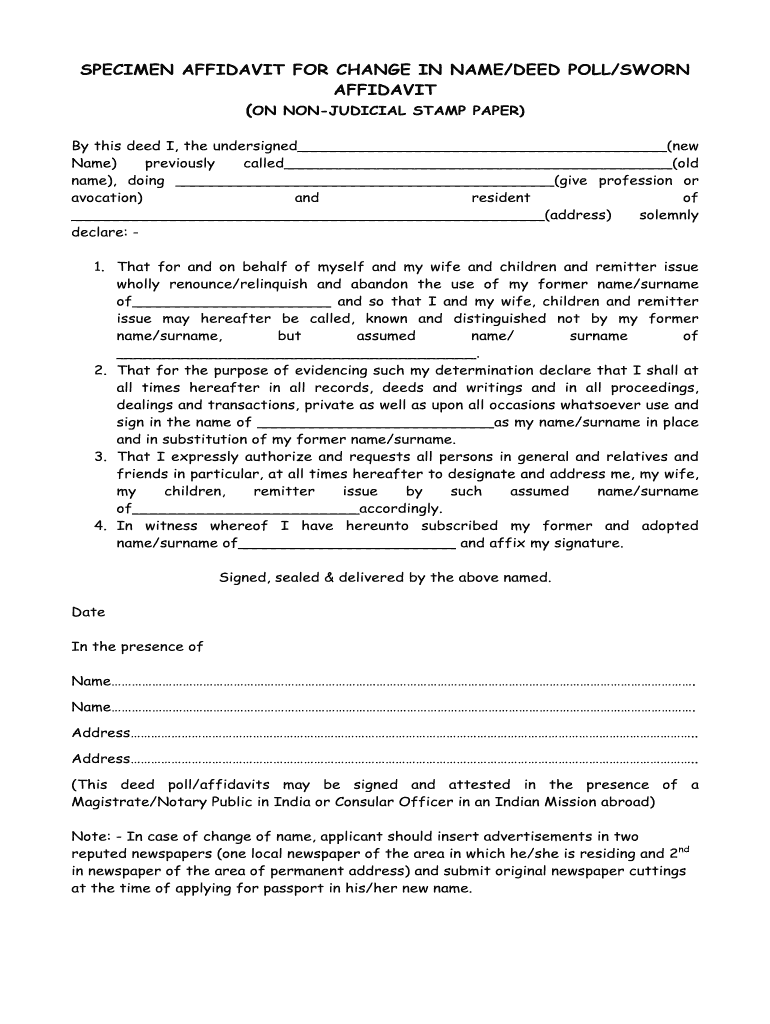 SPECIMEN AFFIDAVIT FOR CHANGE IN NAME/DEED POLL/AFFIDAVIT (ON NONJUDICIAL STAMP PAPER) By this deed I, the undersigned (new Name) previously called (old name), doing (give profession or avocation)
