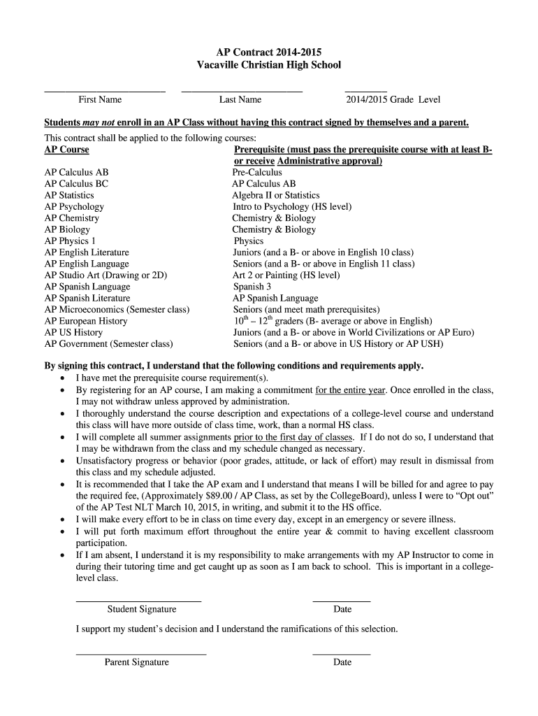 AP Contract 20142015 Vacaville Christian High School First Name Last Name 2014/2015 Grade Level Students may not enroll in an AP Class without having this contract signed by themselves and a parent.