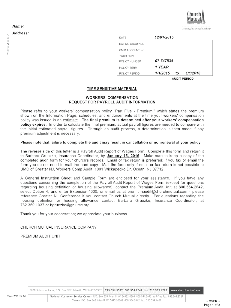 Name: A C C O U N T Address: DATE 12/01/2015 RATING GROUP NO COMIC ACCOUNT NO. YOUR VEIN POLICY NUMBER 07747534 POLICY TERM 1 YEAR POLICY PERIOD 1/1/2015 to 1/1/2016 AUDIT PERIOD TIME SENSITIVE MATERIAL