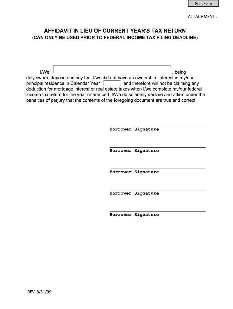 Print Form ATTACHMENT J AFFIDAVIT IN LIEU OF CURRENT YEAR IS TAX RETURN (CAN ONLY BE USED PRIOR TO FEDERAL INCOME TAX FILING DEADLINE) I/We, being duly sworn, depose and say that I/we did not have