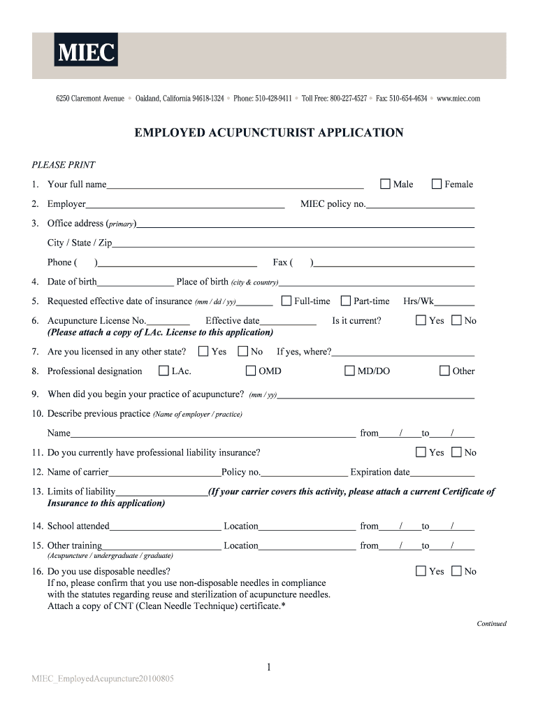 IEC EMPLOYED ACUPUNCTURIST APPLICATION PLEASE PRINT Male 1. Your full name Female IEC policy no. 2. Employer 3. Office address (primary) City / State / Zip Phone (Fax ()) Place of birth (city & country)
