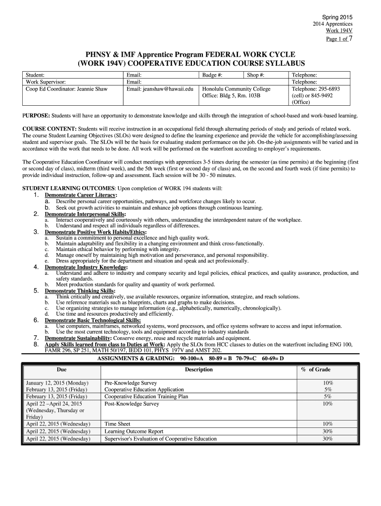 Clear Form Spring 2015 2014 Apprentices Work 194V Page 1 of 7 PANSY & IMF Apprentice Program FEDERAL WORK CYCLE (WORK 194V) COOPERATIVE EDUCATION COURSE SYLLABUS Student: Work Supervisor: Coop Ed