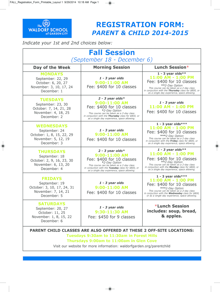 FALL Registration Form Printable Layout 1 9/29/2014 10:18 AM Page 1 registration form: PARENT & CHILD 20142015 Indicate your 1st and 2nd choices below: fall session (September 18 December 6) day of