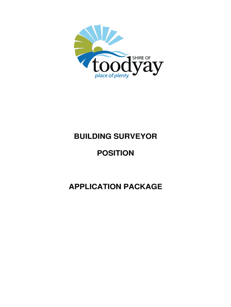 BUILDING SURVEYOR POSITION APPLICATION PACKAGE Dear Applicant Thank you for your interest regarding the position of Building Surveyor with the Shire of Today, an equal opportunity employer. The following
