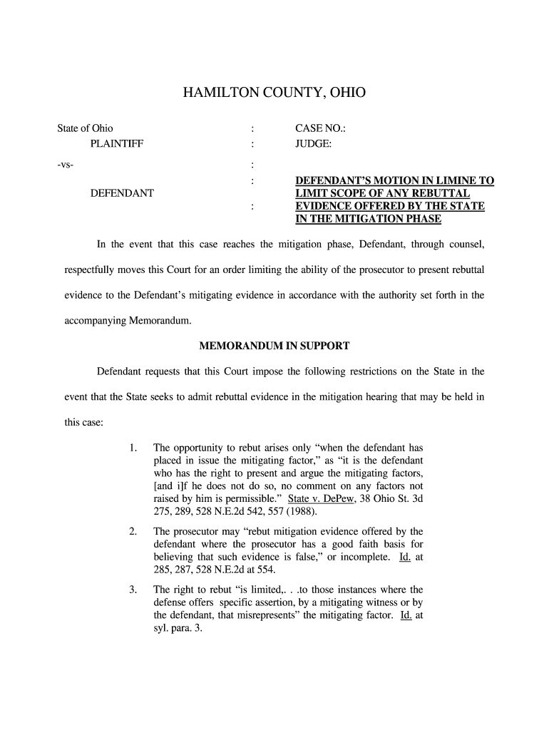 HAMILTON COUNTY, OHIO State of Ohio PLAINTIFF : : vs : : DEFENDANT : CASE NO.: JUDGE: DEFENDANTS MOTION IN LIMING TO LIMIT SCOPE OF ANY REBUTTAL EVIDENCE OFFERED BY THE STATE IN THE MITIGATION PHASE