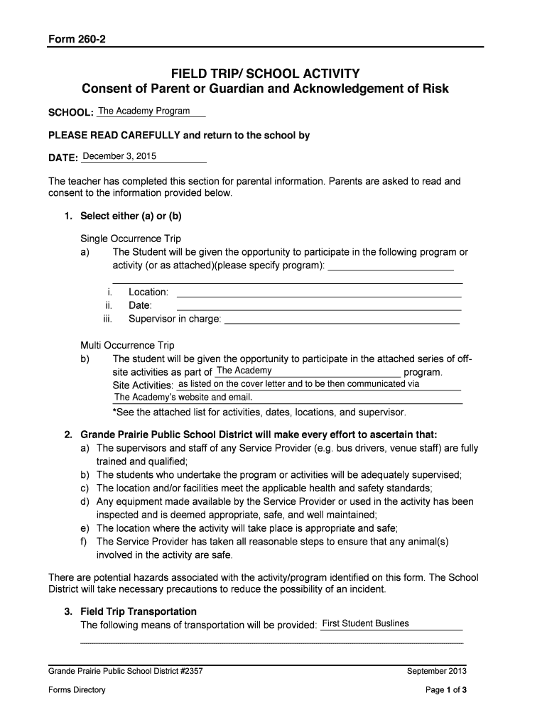 Form 2602 FIELD TRIP/ SCHOOL ACTIVITY Consent of Parent or Guardian and Acknowledgement of Risk SCHOOL: PLEASE READ CAREFULLY and return to the school by DATE: The teacher has completed this section