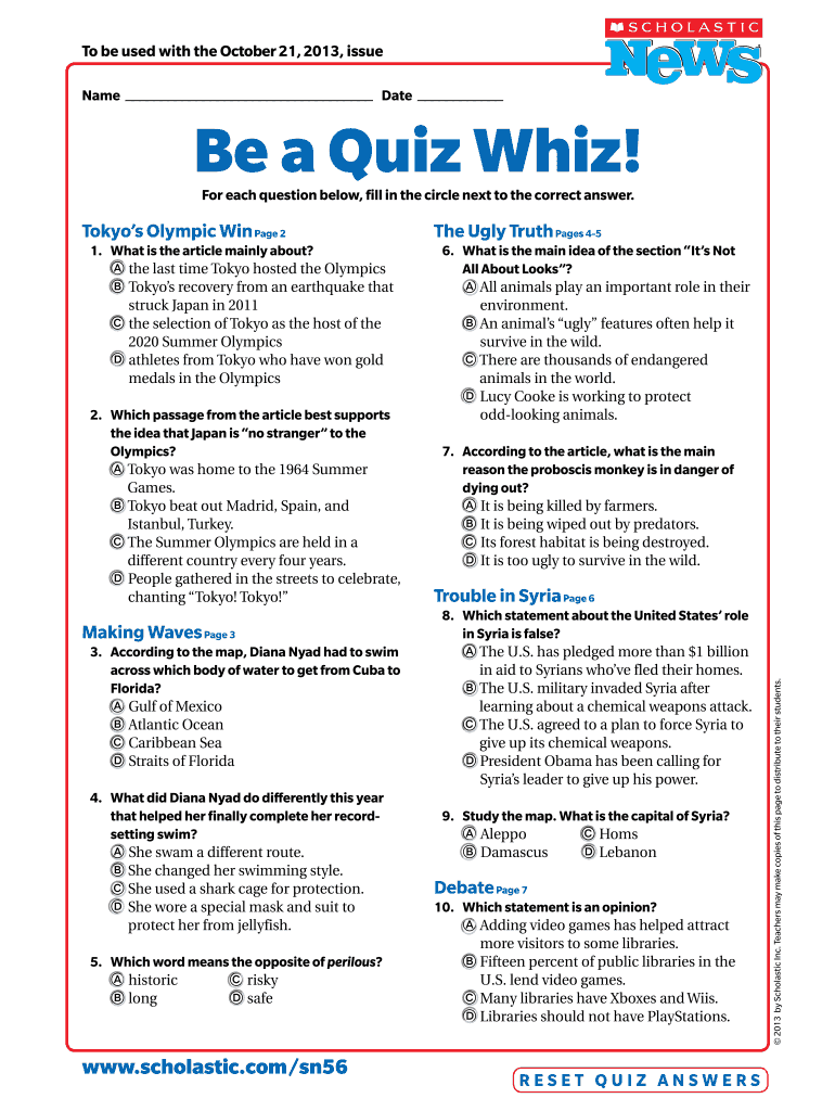 To be used with the October 21, 2013, issue Name Date Be a Quiz Whiz! For each question below, fill in the circle next to the correct answer. Tokyo's Olympic Win Page 2 The Ugly Truth Pages 45 1.