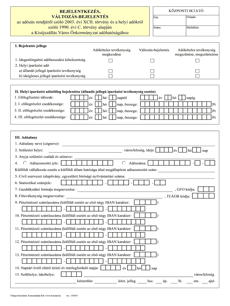 Get the free BEJELENTKEZS KZPONTI IKTAT VLTOZS-BEJELENTS az - kisujszallas