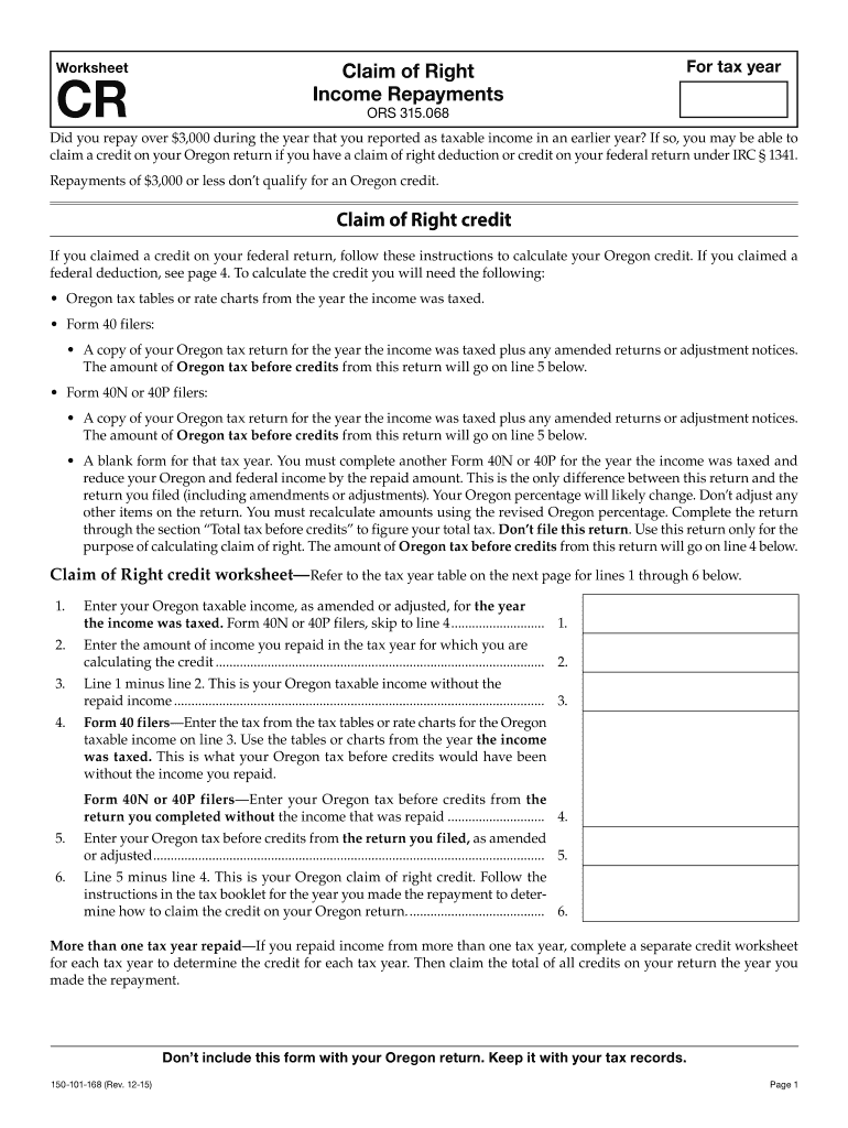 Clear form Claim of Right Income Repayments Worksheet CR For tax year ORS 315.068 Did you repay over $3,000 during the year that you reported as taxable income in an earlier year? If so, you may be