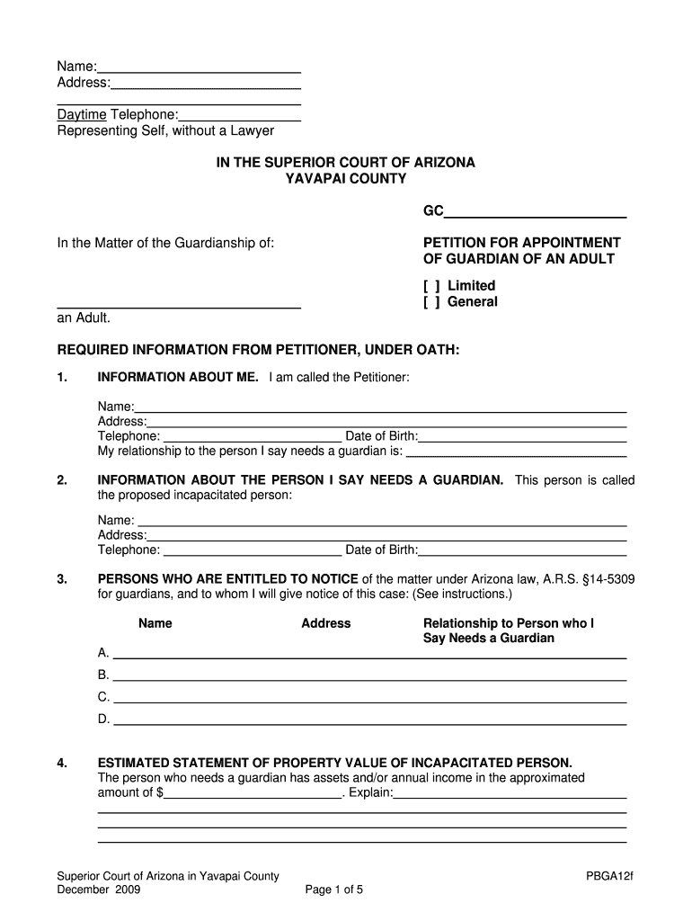 Name: Address: Daytime Telephone: Representing Self, without a Lawyer IN THE SUPERIOR COURT OF ARIZONA YAVAPAI COUNTY GC In the Matter of the Guardianship of: PETITION FOR APPOINTMENT OF GUARDIAN