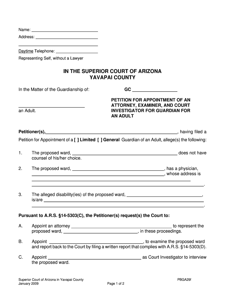 Name: Address: Daytime Telephone: Representing Self, without a Lawyer IN THE SUPERIOR COURT OF ARIZONA YAVAPAI COUNTY In the Matter of the Guardianship of: an Adult. GC PETITION FOR APPOINTMENT OF