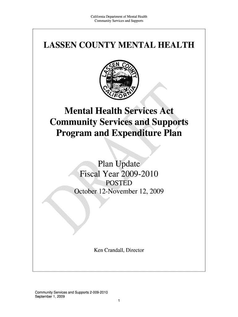 California Department of Mental Health Community Services and Supports LASSEN COUNTY MENTAL HEALTH Services Act Community Services and Supports Program and Expenditure Plan Update Fiscal Year 20092010