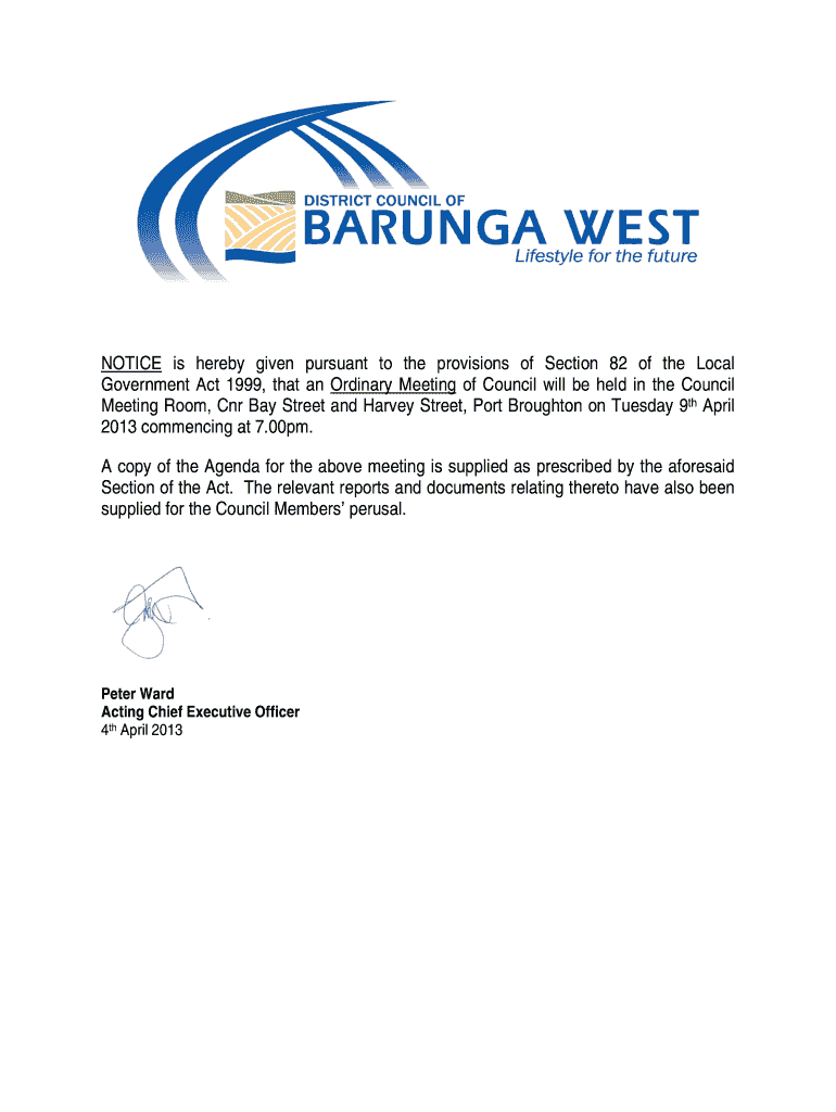 NOTICE is hereby given pursuant to the provisions of Section 82 of the Local Government Act 1999, that an Ordinary Meeting of Council will be held in the Council Meeting Room, CNR Bay Street and Harvey