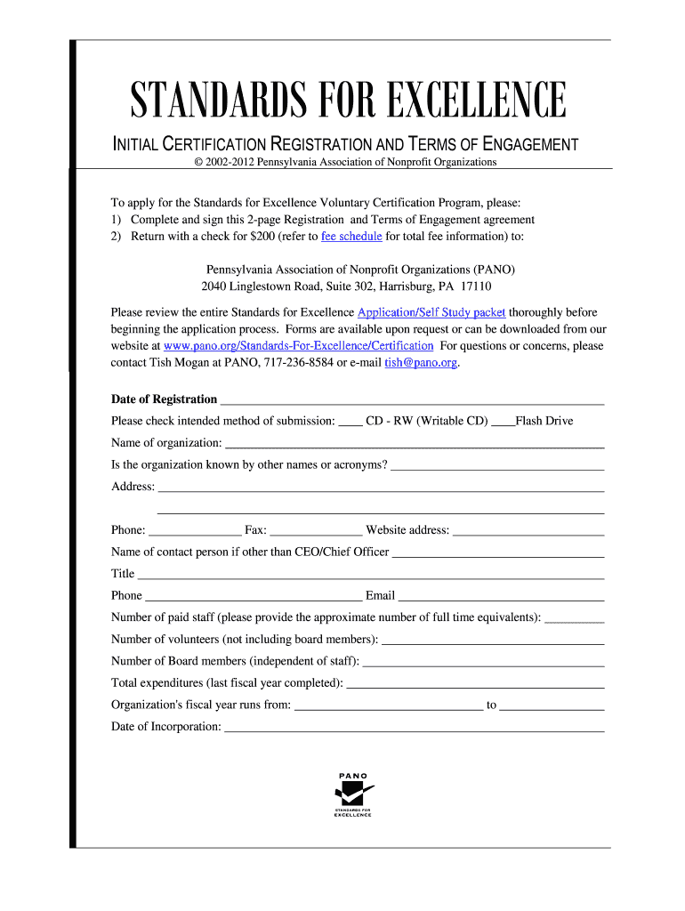 STANDARDS FOR EXCELLENCE INITIAL CERTIFICATION REGISTRATION AND TERMS OF ENGAGEMENT 20022012 Pennsylvania Association of Nonprofit Organizations To apply for the Standards for Excellence Voluntary