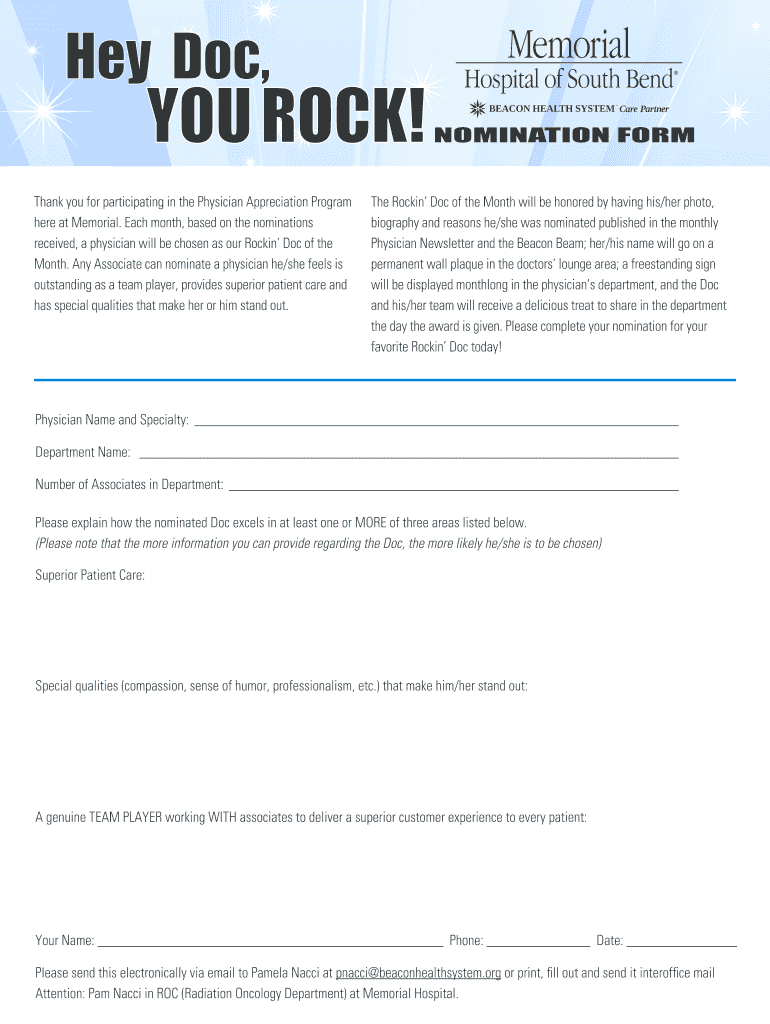 NOMINATION FORM Thank you for participating in the Physician Appreciation Program here at Memorial. Each month, based on the nominations received, a physician will be chosen as our Rocking Doc of