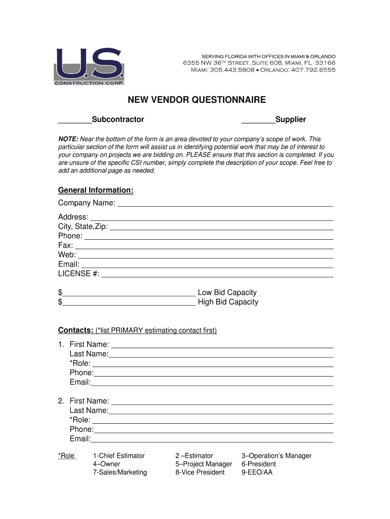 SERVING FLORIDA WITH OFFICES IN MIAMI & ORLANDO 6355 NW 36th Street, Suite 608, Miami, FL 33166 Miami: 305.443.5808 Orlando: 407.792.6555 NEW VENDOR QUESTIONNAIRE Subcontractor Supplier NOTE: Near