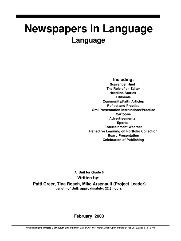 Newspapers in Language Including: Scavenger Hunt The Role of an Editor Headline Stories Editorials Community/Faith Articles Reflect and Practice Oral Presentation Instructions/Practice Cartoons Advertisements