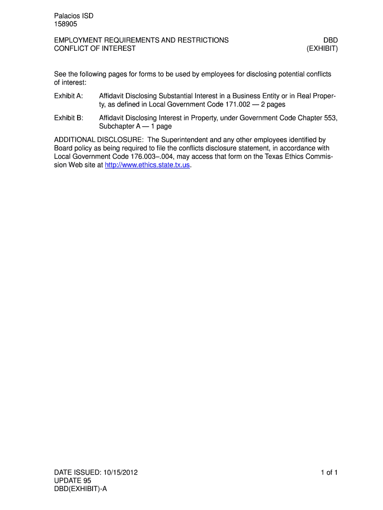 Palacios ISD 158905 EMPLOYMENT REQUIREMENTS AND RESTRICTIONS CONFLICT OF INTEREST DBD (EXHIBIT) See the following pages for forms to be used by employees for disclosing potential conflicts of interest: