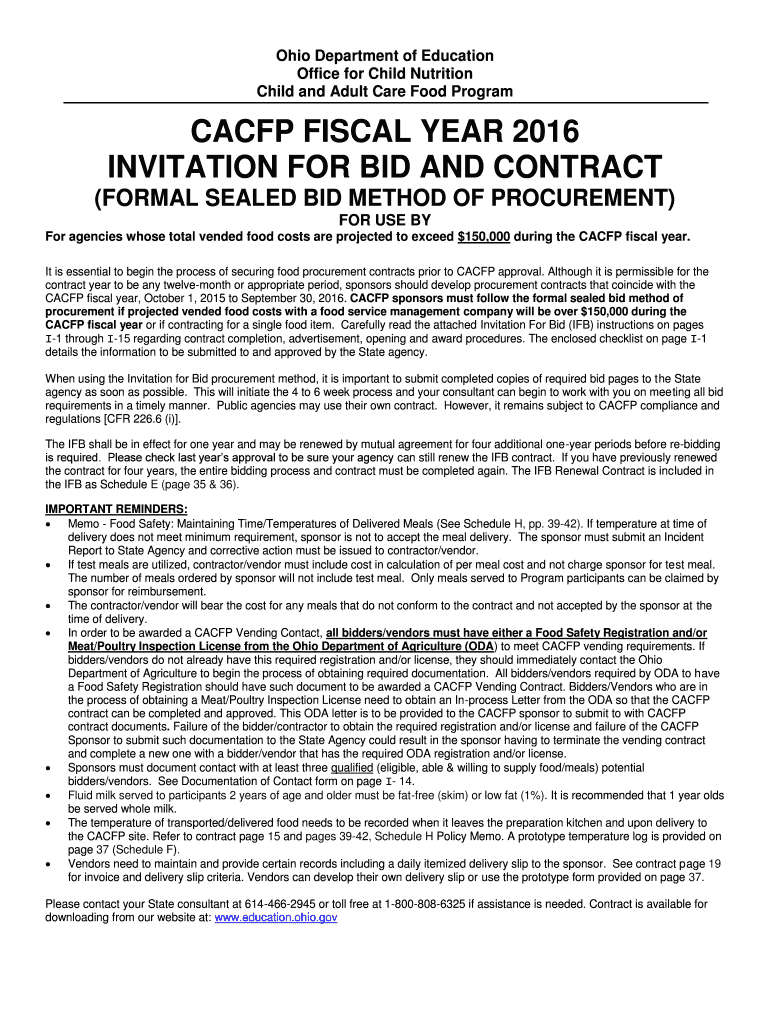 Ohio Department of Education Office for Child Nutrition Child and Adult Care Food Program CA CFP FISCAL YEAR 2016 INVITATION FOR BID AND CONTRACT (FORMAL SEALED BID METHOD OF PROCUREMENT) FOR USE