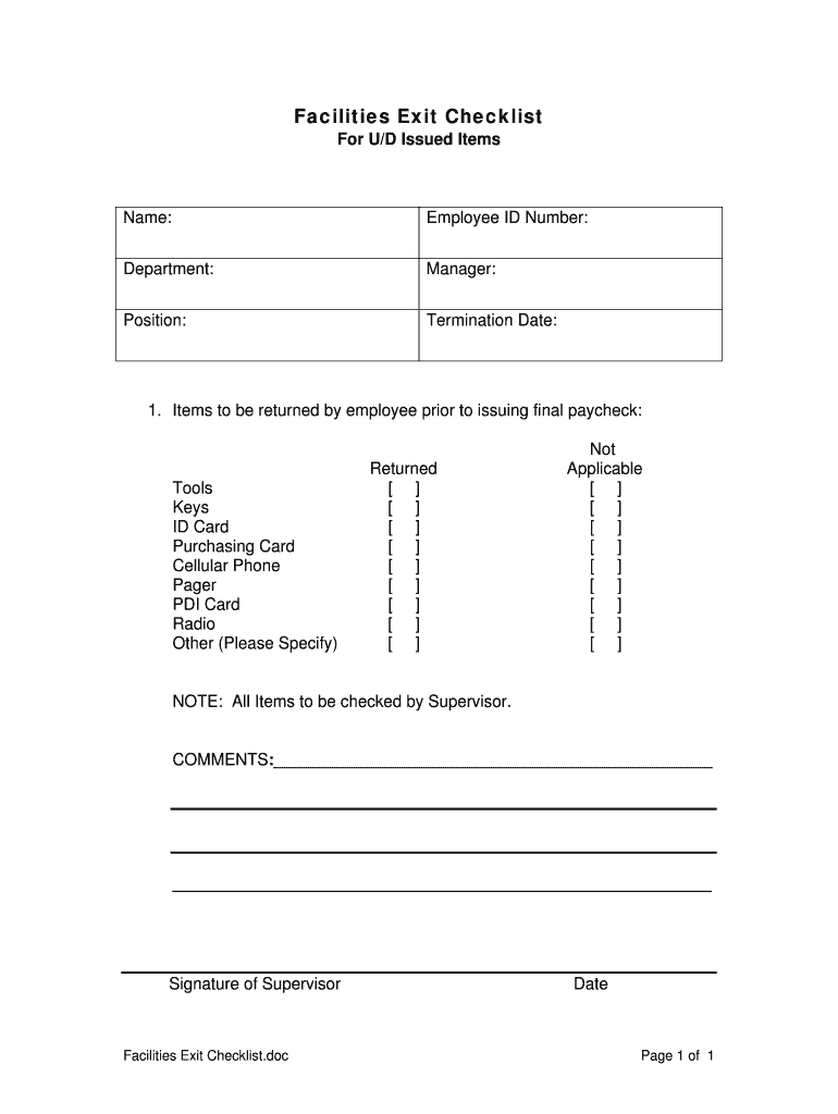Facilities Exit Checklist For U/D Issued Items Name: Employee ID Number: Department: Manager: Position: Termination Date: 1. Items to be returned by employee prior to issuing final paycheck: Tools