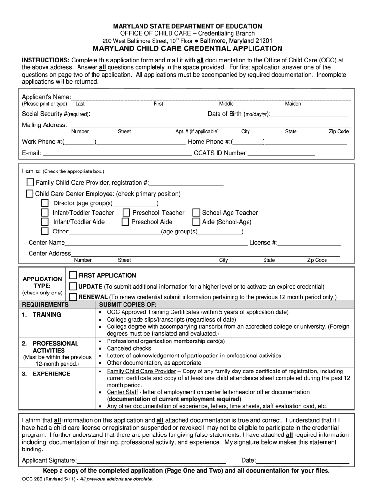 MARYLAND STATE DEPARTMENT OF EDUCATION OFFICE OF CHILD CARE Credentialing Branch TH 200 West Baltimore Street, 10 Floor Baltimore, Maryland 21201 MARYLAND CHILD CARE CREDENTIAL APPLICATION INSTRUCTIONS: