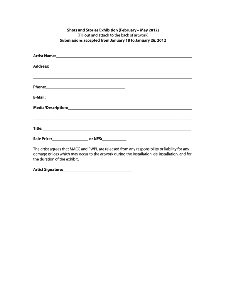 This document is a submission form for artists participating in the Shots and Stories Exhibition, collecting necessary information about the artist and their artwork.