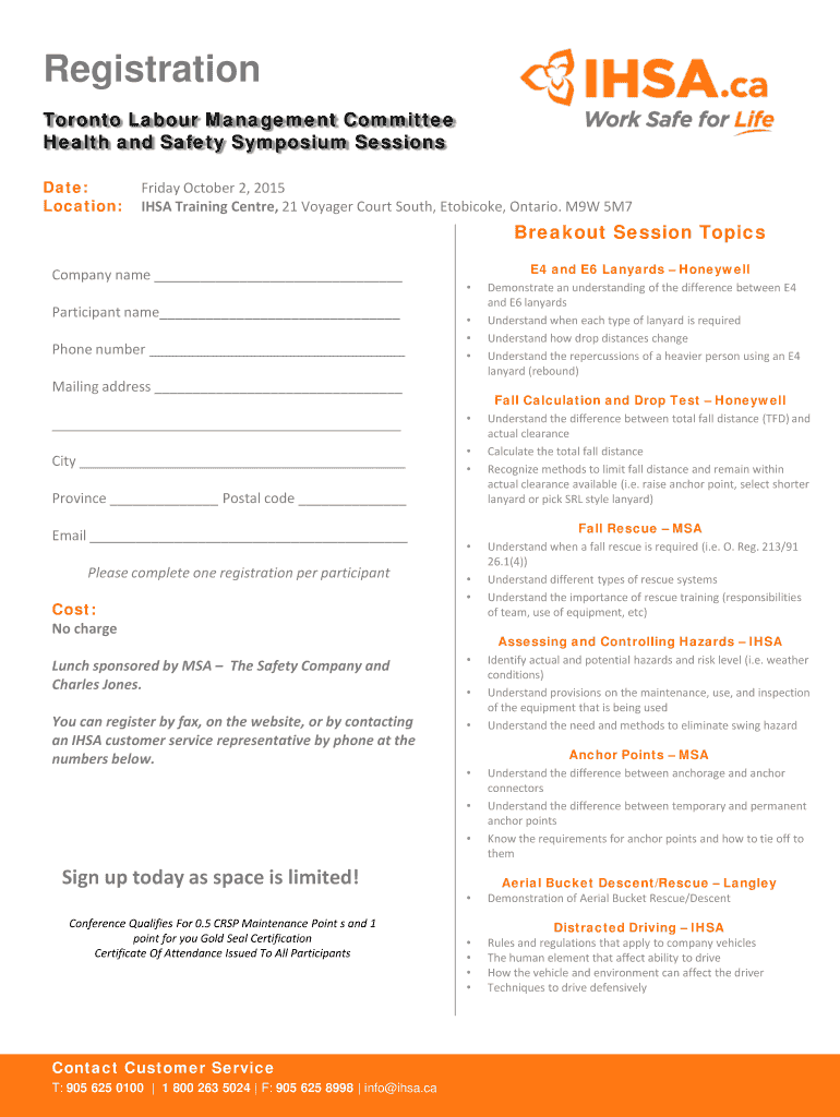 Health and Safety Symposium for Owners, Managers, Supervisors, Chaos and Certified Members Friday, October 2, 2015, IHS Training Center 21 Voyager Court South Etobicoke, Ontario M9W 5M7 Time: 8:30