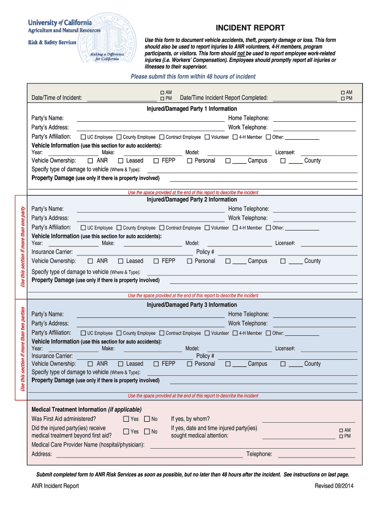 INCIDENT REPORT Use this form to document vehicle accidents, theft, property damage or loss. This form should also be used to report injuries to ANR volunteers, 4H members, program participants, or