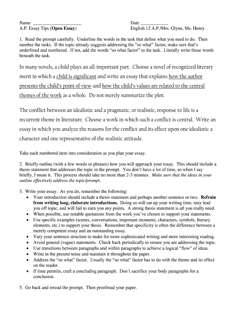 Name A.P. Essay Tips (Open Essay) Date English 12 A.P./Mrs. Glynn, Ms. Henry 1. Read the prompt carefully. Underline the words in the task that define what you need to do. Then number the tasks. If