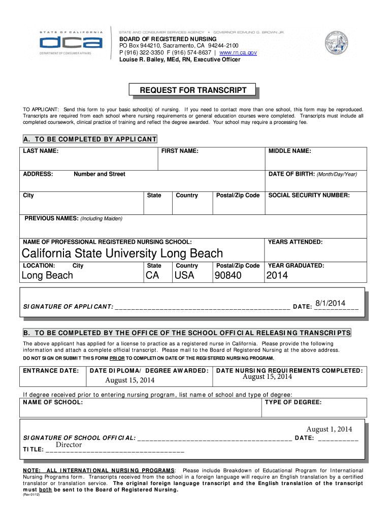 BOARD OF REGISTERED NURSING PO Box 944210, Sacramento, CA 942442100 P (916) 3223350 F (916) 5748637 www.rn.ca.gov Louise R. Bailey, Med, RN, Executive Officer REQUEST FOR TRANSCRIPT TO APPLICANT: