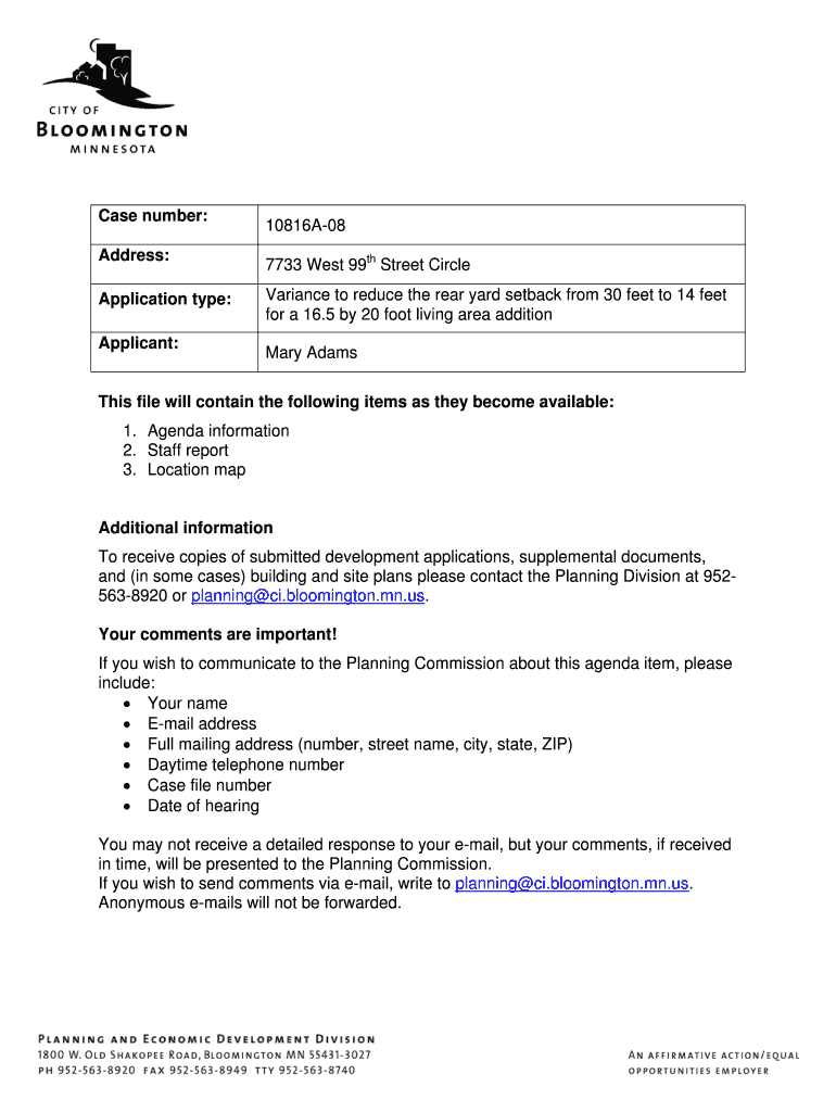 This document outlines a request for a variance to reduce the rear yard setback for a living area addition at 7733 West 99th Street Circle. It includes details about the proposal, applicant information,