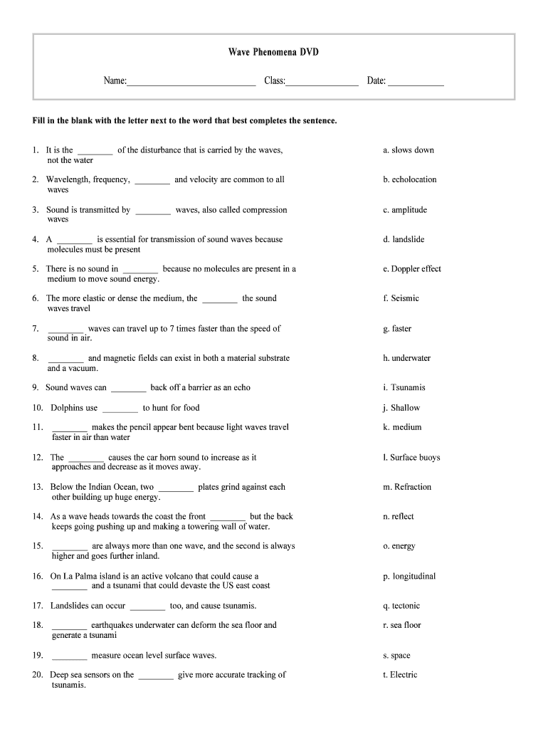 Wave Phenomena DVD Name: Class: Date: Fill in the blank with the letter next to the word that best completes the sentence. 1. It is the of the disturbance that is carried by the waves, not the water