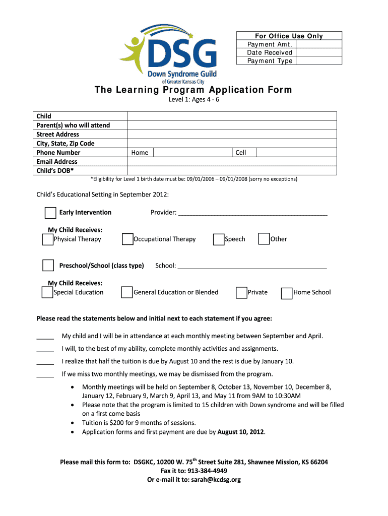 For Office Use Only Payment Amt. Date Received Payment Type The Learning Program Application Form Level 1: Ages 4 6 Child Parent(s) who will attend Street Address City, State, Zip Code Phone Number
