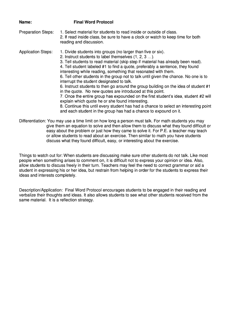 Name:Final Word ProtocolPreparation Steps:1. Select material for students to read inside or outside of class.
