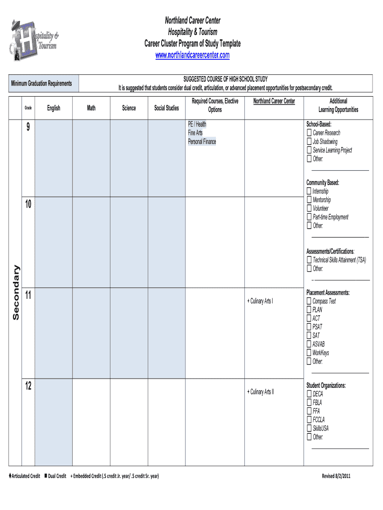 NorthlandCareerCenter Hospitality&Tourism Career Cluster Program of Study Template www.northlandcareercenter.com SUGGESTED COURSE OF HIGH SCHOOL STUDY It is suggested that students consider dual credit,