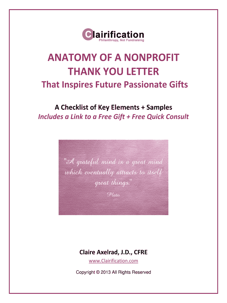 ANATOMY OF A NONPROFIT Thank-you LETTER That Inspires Future Passionate Gifts A Checklist of Key Elements + Samples Includes a Link to a Gift + Free Quick Consult Claire Axel rad, J.D., CARE www.Clairification.com